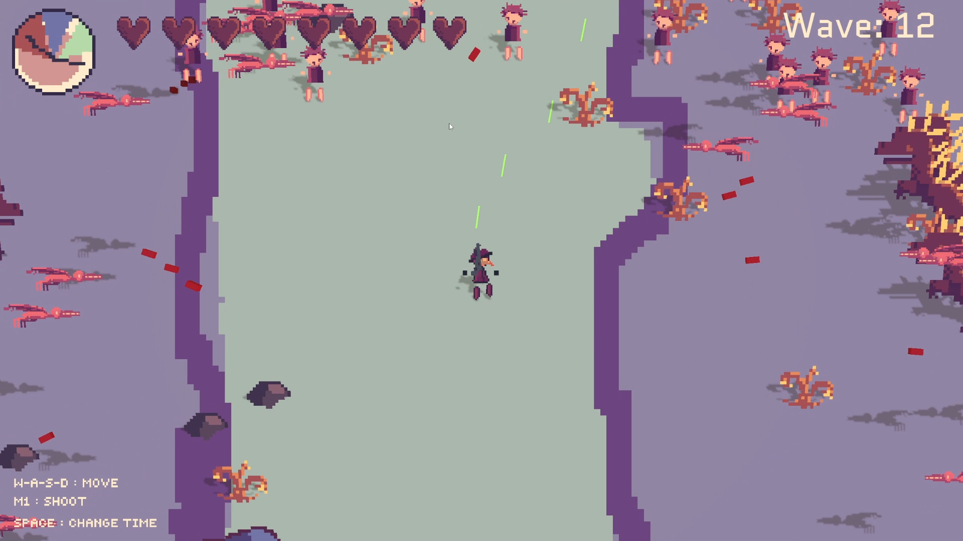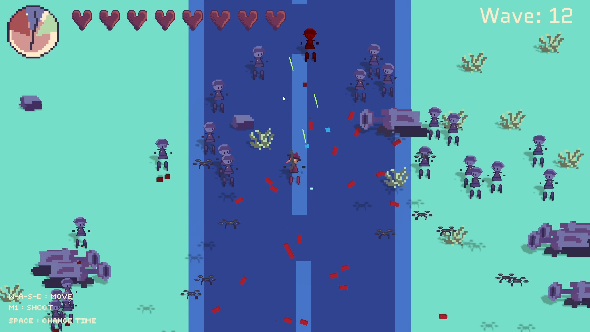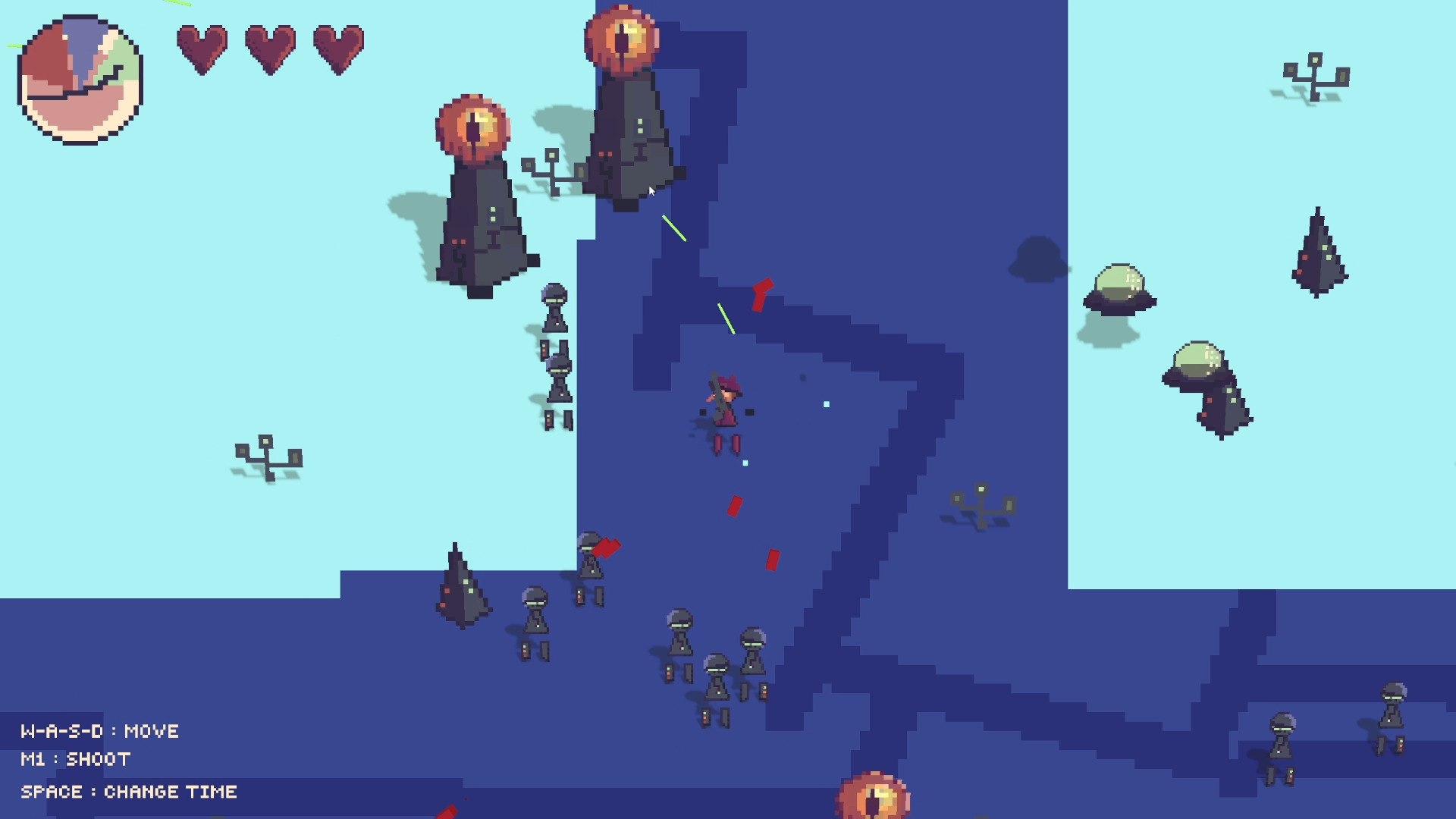 A top-down wave shooter game where you go back and forth in time to beat your enemies when they were weaker or stronger.